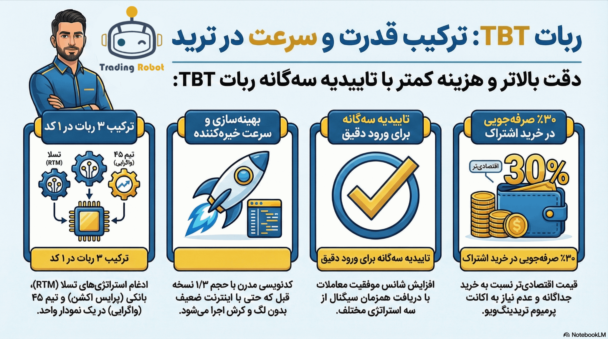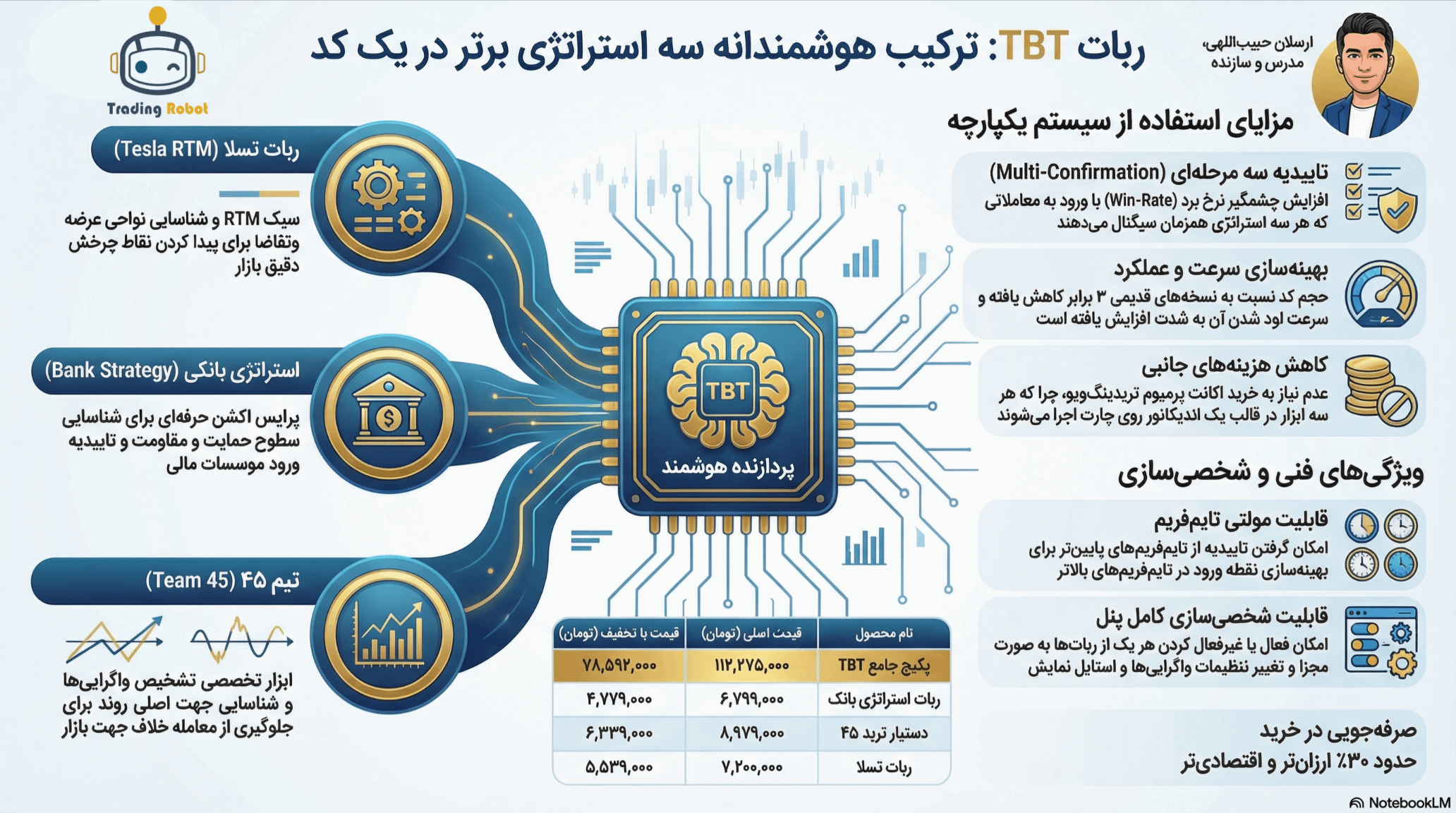 ربات TBT صرفاً یک ابزار نیست، بلکه یک ایستگاه کاری کامل است که پیچیدگیهای تحلیل تکنیکال را در یک قالب ساده و قدرتمند خلاصه کرده است. با ترکیب استراتژیهای بانکی (PDS)، تسلا و تیم ۴۵، شما به جای غرق شدن در اندیکاتورهای مختلف، روی مدیریت سود خود تمرکز میکنید. آیا آماده هستید تا از چارتهای آشفته و سیستمهای کند، به سمت یک جریان کاری حرفهای و سودده حرکت کنید؟